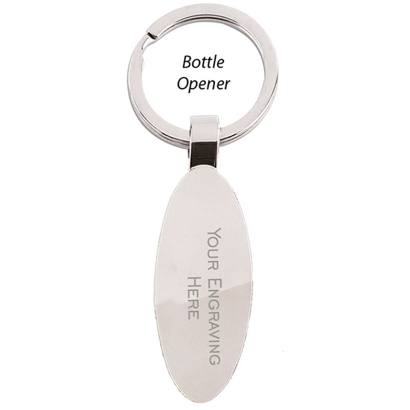 Oval shaped keyring bottle opener.