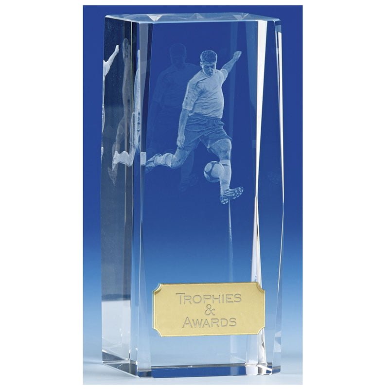 This heavy glass award is detailed with a 3D footballer inside. Complete with presentation box!