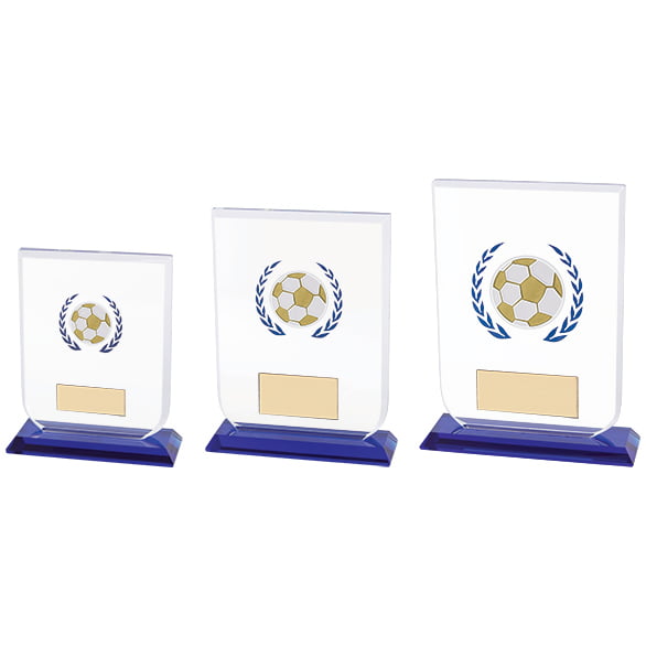 Gladiator awards are a range of glass trophies detailed with a blue glass base and a wreath design. Complete in a presentation box