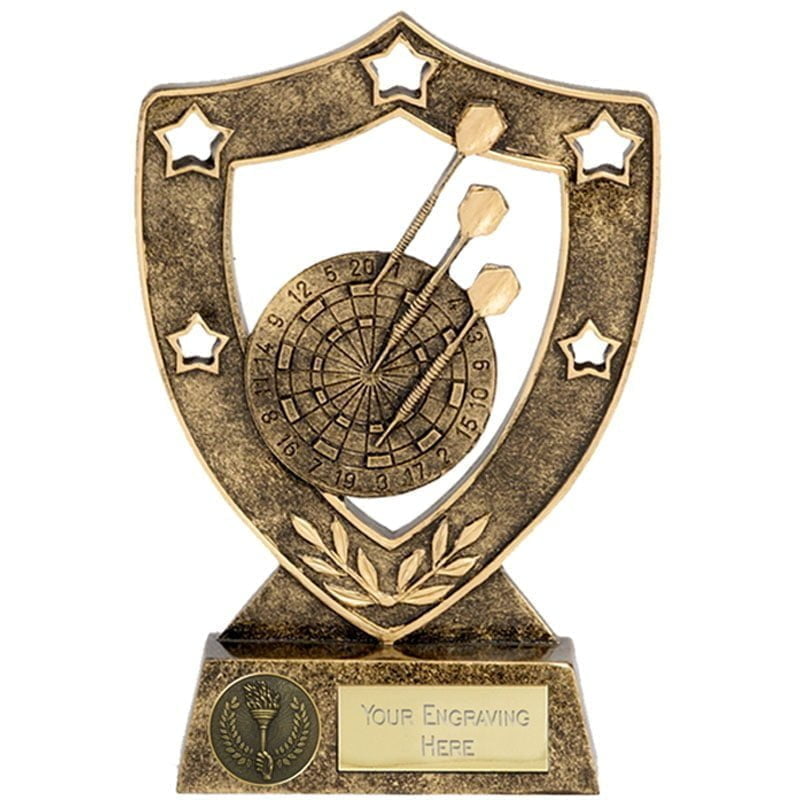 Shield shaped trophy with a darts board and a set of 3 darts.